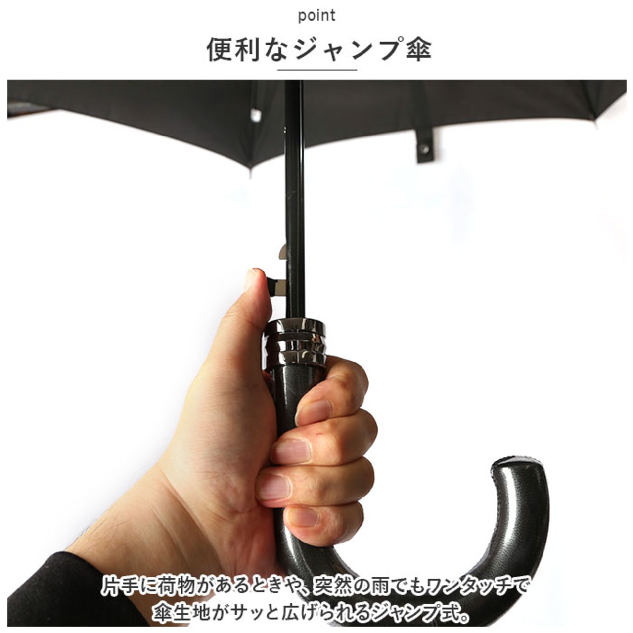 ・片手に荷物があるときや、突然の雨でもワンタッチで傘生地がサッと広げられるジャンプ式。