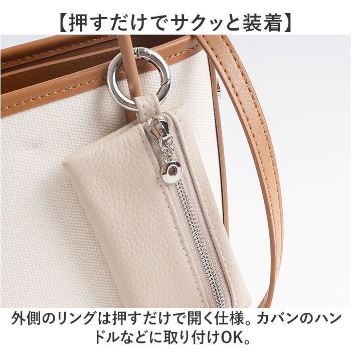 ・外側のリングは押すだけで開く仕様。カバンのハンドルなどに取り付けOK。