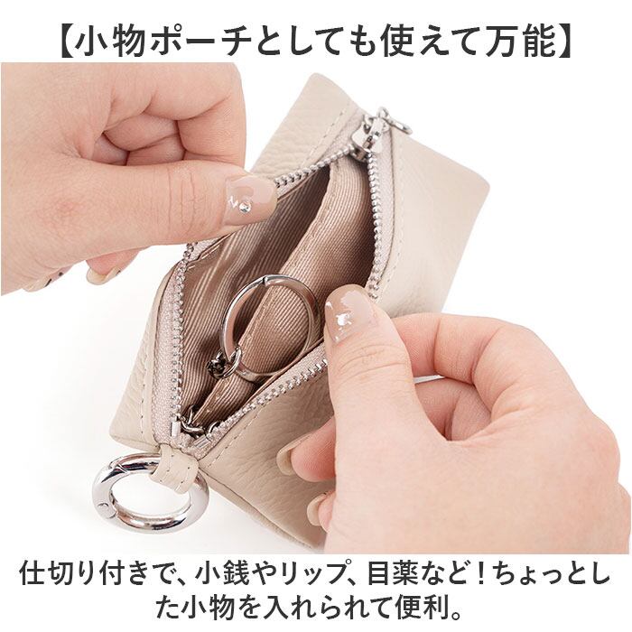 ・仕切り付きで、小銭やリップ、目薬など!ちょっとした小物を入れられて便利。