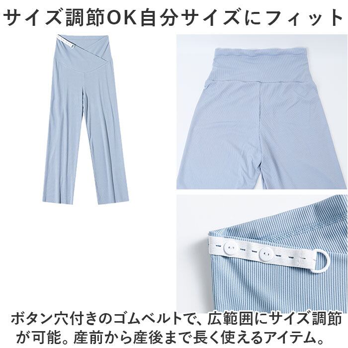 ・ボタン穴付きのゴムベルトで、広範囲にサイズ調節が可能。産前から産後まで長く使えるアイテム。