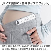 ・ボタン穴付きのゴムベルトで、広範囲にサイズ調節が可能。産前から産後まで長く使えるアイテム。
