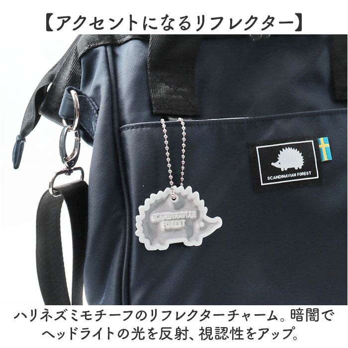 ・ハリネズミモチーフのリフレクターチャーム。暗闇でヘッドライトの光を反射、視認性をアップ。
