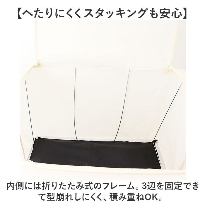 ・内側には折りたたみ式のフレーム。3辺を固定できて型崩れしにくく、積み重ねOK。