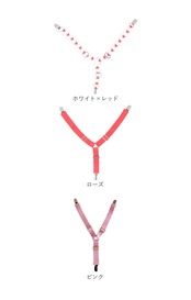 1.サスペンダー中央の三角形の金具をワンちゃんの身体の正面、胸の部分に当てるようにして、長さのある上部2本のベルトを肩に掛ける。