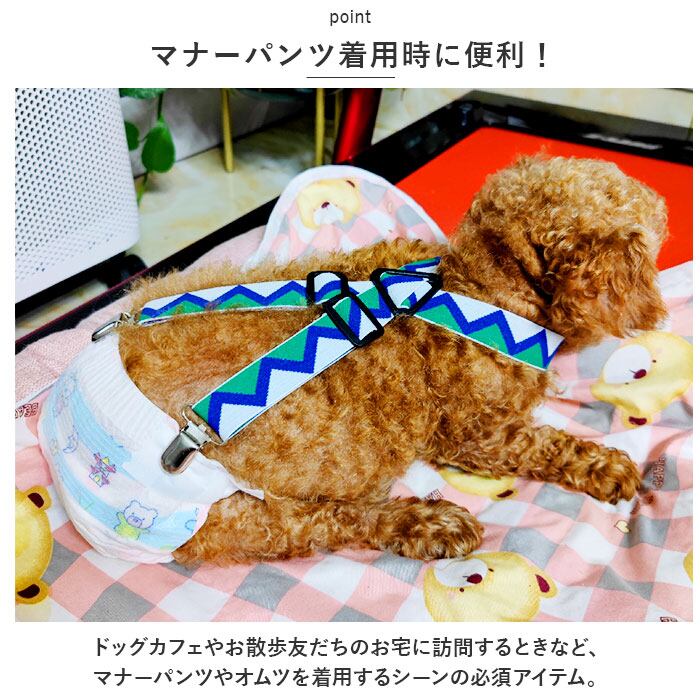 ・お出掛け中のオムツのズレ、もう気にならない!お洒落で実用的なペット用サスペンダー。