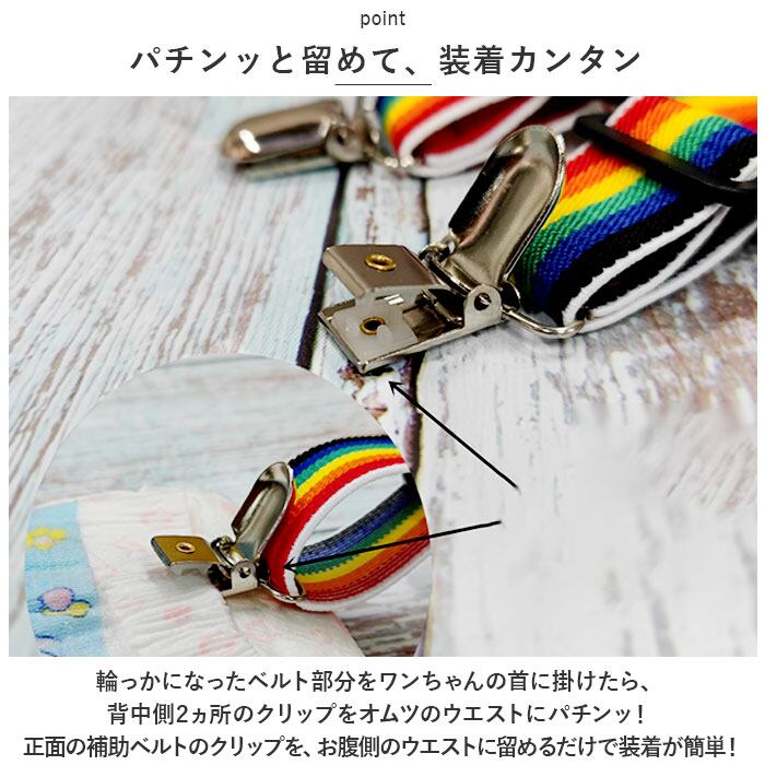 ・輪っかになったベルト部分をワンちゃんの首に掛けたら、背中側2ヵ所のクリップをオムツのウエストにパチンッ!次に、正面の補助ベルトのクリップを、お腹側のウエストに留めるだけで装着が簡単!