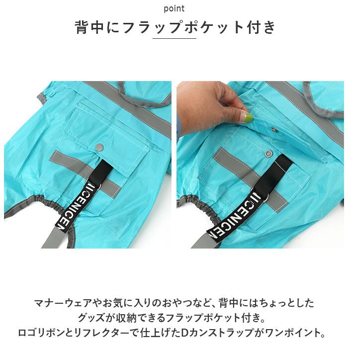 ・マナーウェアやお気に入りのおやつなど、背中にはちょっとしたグッズが収納できるフラップポケット付き。ロゴリボンとリフレクターで仕上げたDカンストラップがワンポイント。