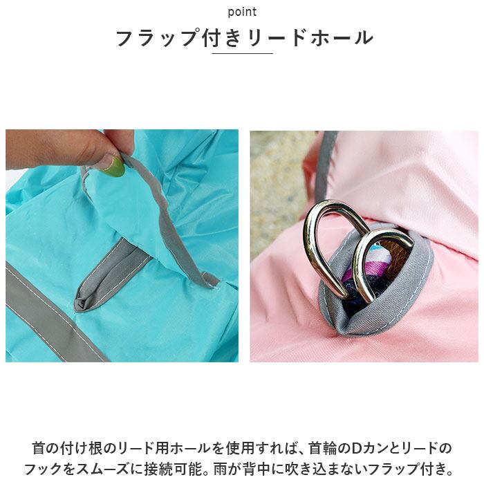 ・首の付け根のリード用ホールを使用すれば、首輪のDカンとリードのフックをスムーズに接続可能。雨が背中に吹き込まないフラップ付き。