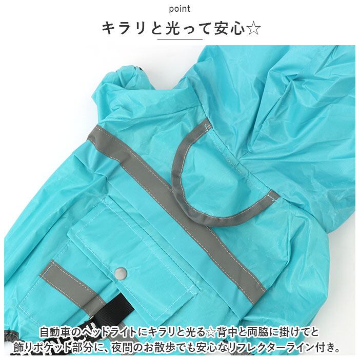 ・自動車のヘッドライトにキラリと光る☆背中と両脇に掛けてと飾りポケット部分に、夜間のお散歩でも安心なリフレクターライン付き。
