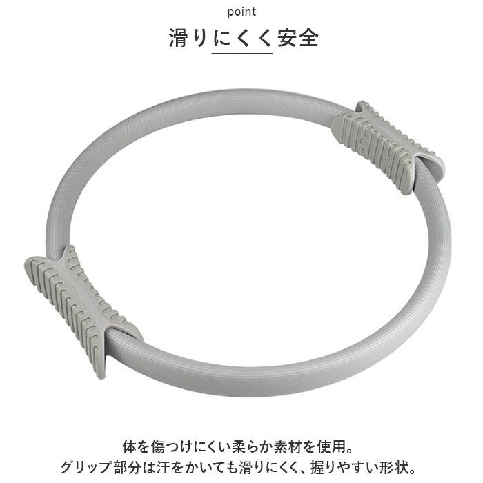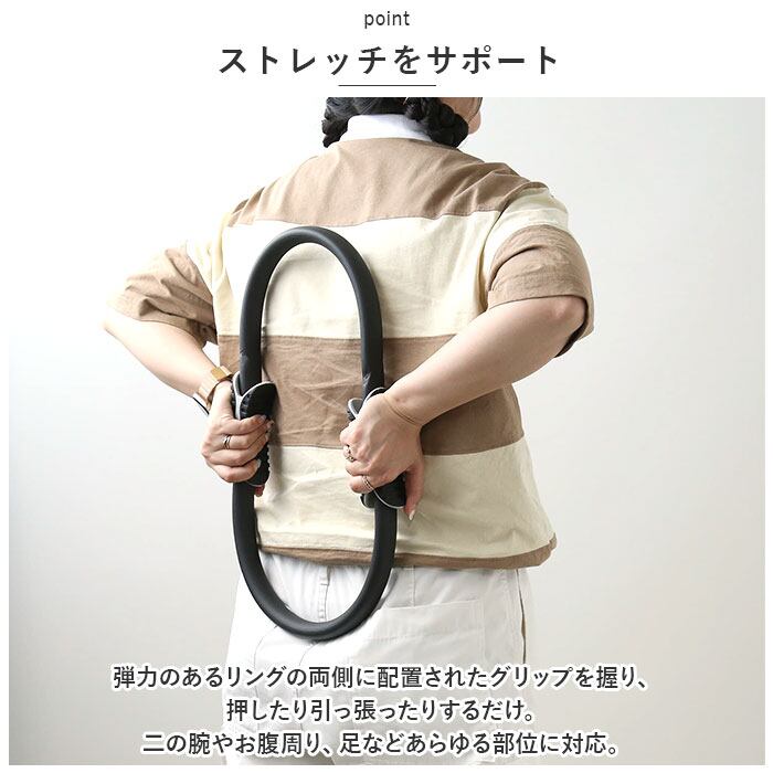 ・弾力のあるリングの両側に配置されたグリップを握り、押したり引っ張ったりするだけ。二の腕やお腹周り、足などあらゆる部位に対応。