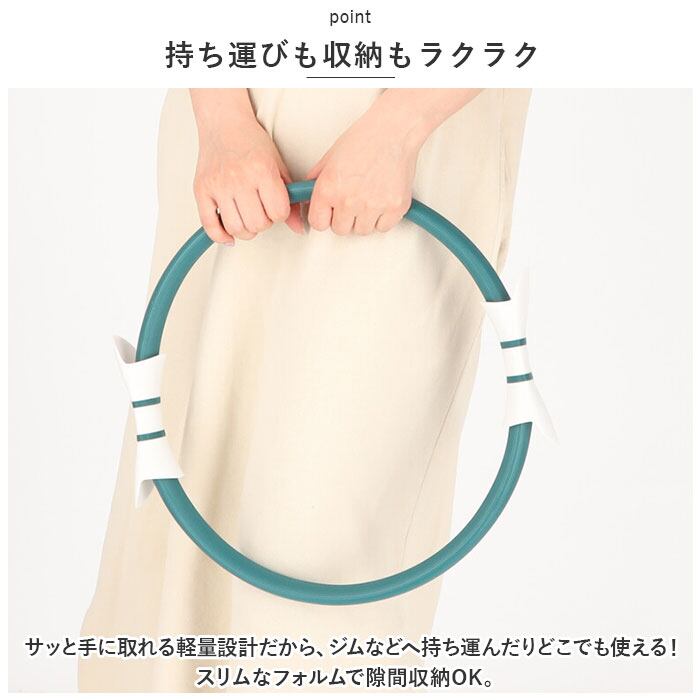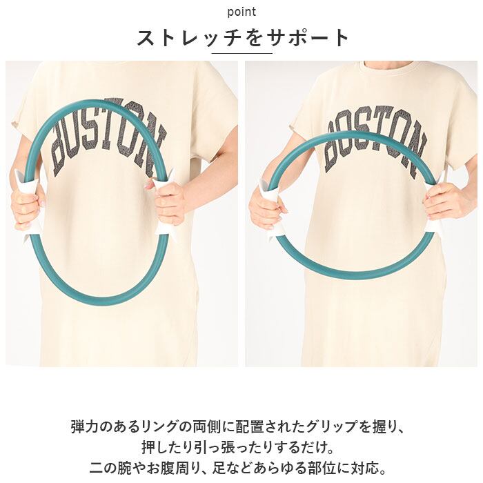 ・弾力のあるリングの両側に配置されたグリップを握り、押したり引っ張ったりするだけ。二の腕やお腹周り、足などあらゆる部位に対応。