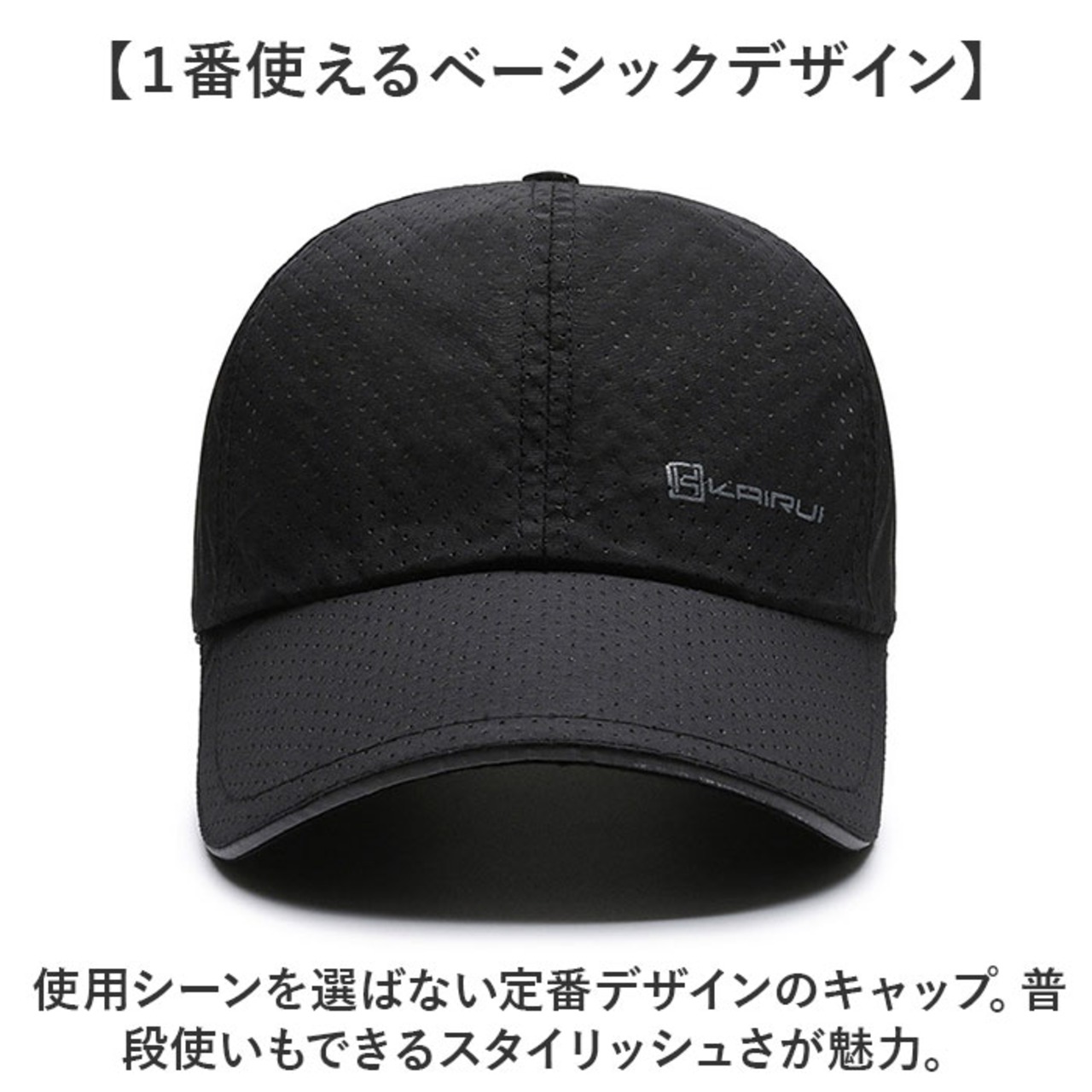 ・使用シーンを選ばない定番デザインのキャップ。普段使いもできるスタイリッシュさが魅力。