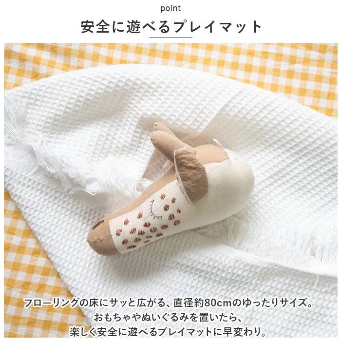 ・フローリングの床にサッと広がる、直径約80cmのゆったりサイズ。おもちゃやぬいぐるみを置いたら、楽しく安全に遊べるプレイマットに早変わり。