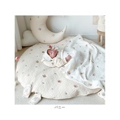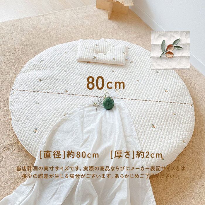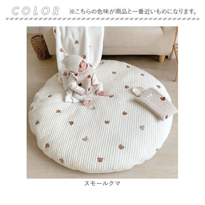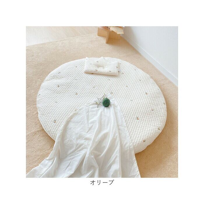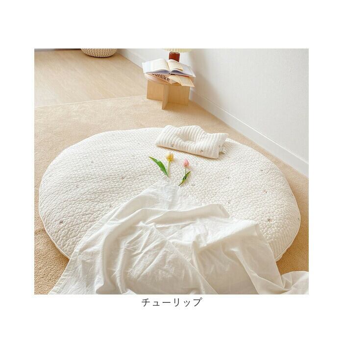 ・ふんわり柔らかなキルティング素材に、アニマルフェイスやフラワー柄の可愛い刺繍がアクセント!おむつ替えやお昼寝用にぴったりのラウンド型クッションマット。