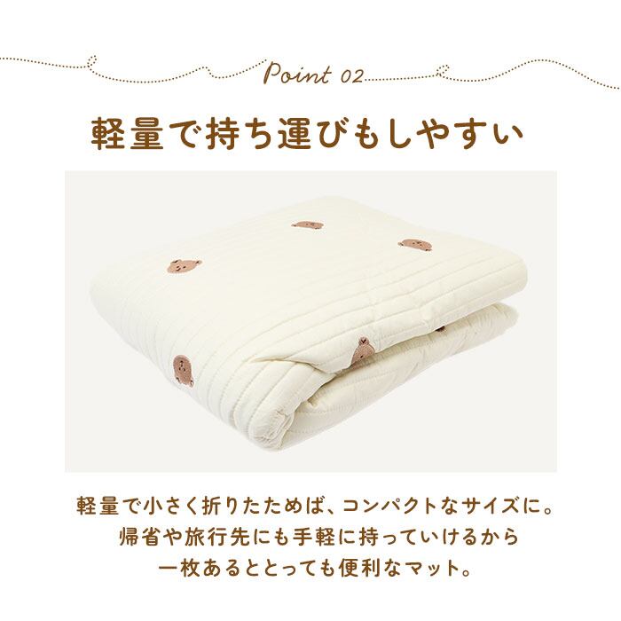 ・マットの中には、赤ちゃんがコロンと快適にねんねできるふんわり柔らかな中綿がたっぷり。底づき感のないしっかりとした厚みで、ママがとなりで横になっても大丈夫♪