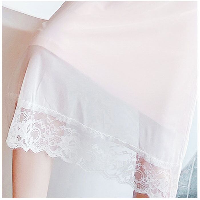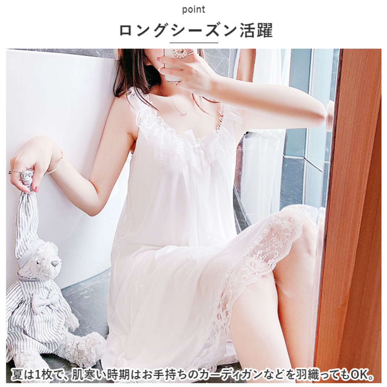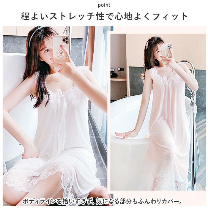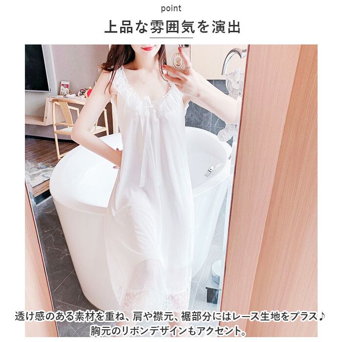 ・透け感のある素材を重ね、肩や襟元、裾部分にはレース生地をプラス♪胸元のリボンデザインもアクセント。