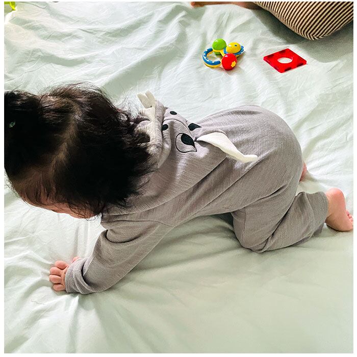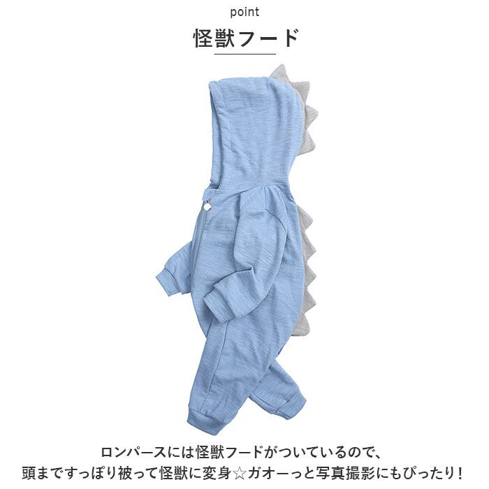 ・ロンパースには怪獣フードがついているので、頭まですっぽり被って怪獣に変身☆ガオーっと写真撮影にもぴったり!