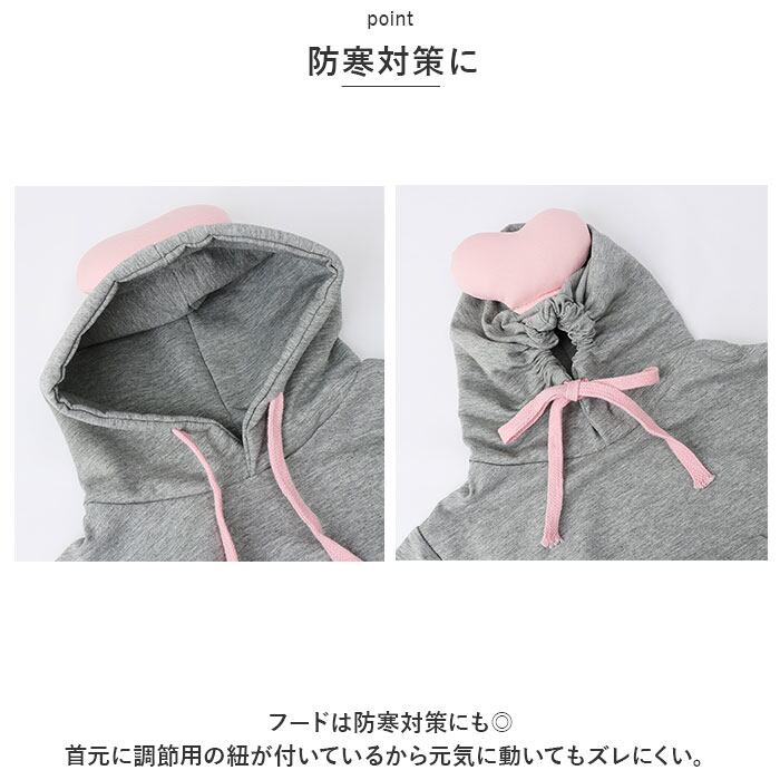 ・フードは防寒対策にも◎首元に調節用の紐が付いているから元気に動いてもズレにくい。