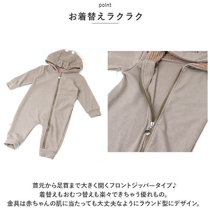 ・首元から足首まで大きく開くフロントジッパータイプ♪着替えもおむつ替えも楽々できちゃう優れもの。金具は赤ちゃんの肌に当たっても大丈夫なようにラウンド型にデザイン。