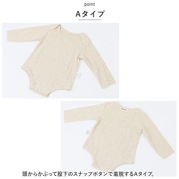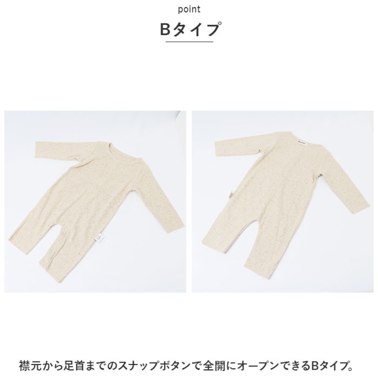 ・頭からかぶって股下のスナップボタンで着脱するAタイプ。襟元から足首までのスナップボタンで全開にオープンできるBタイプ。どちらもおむつ替えの際に、洋服を脱がす必要なし!(※タイプによりフォルムや丈感が異なります。)