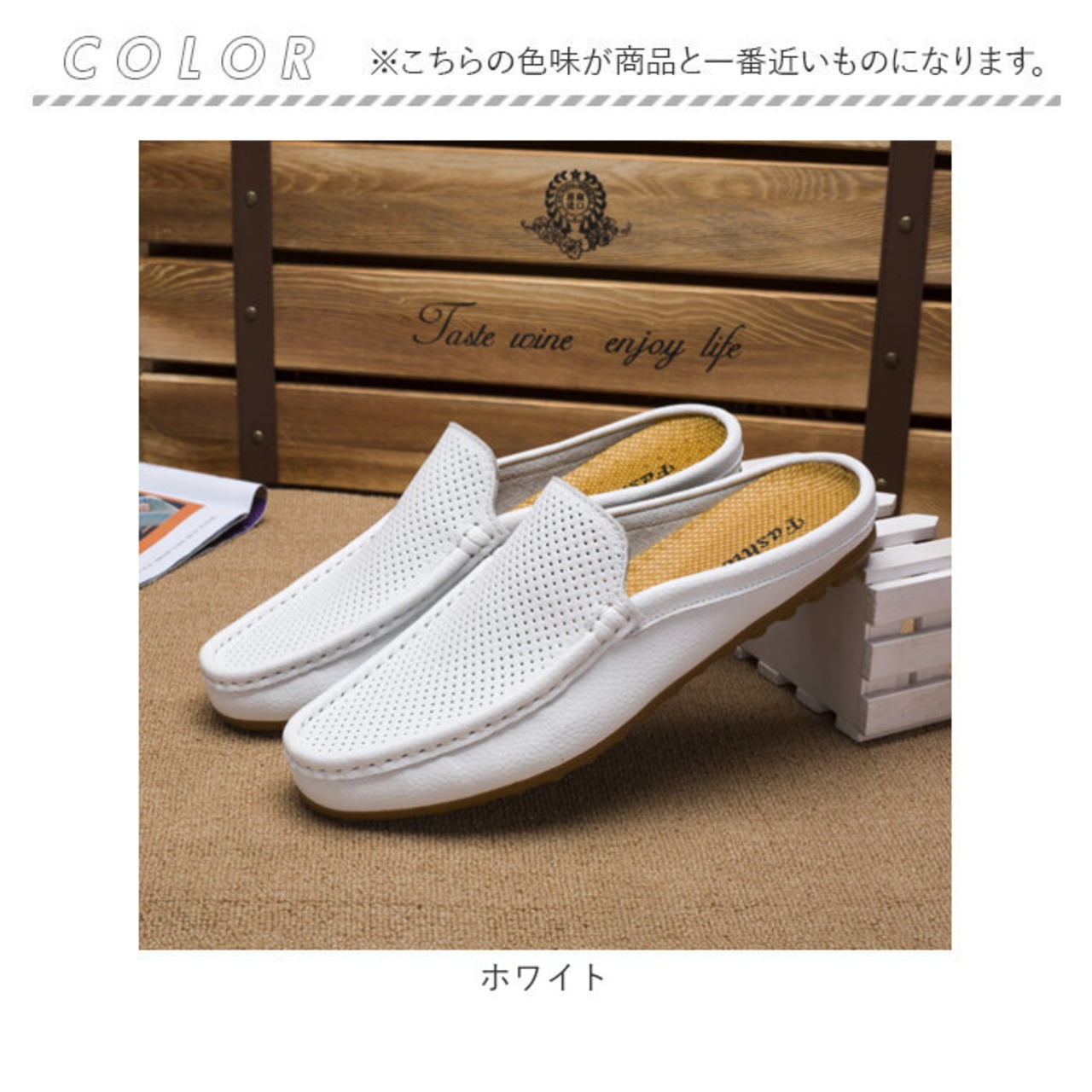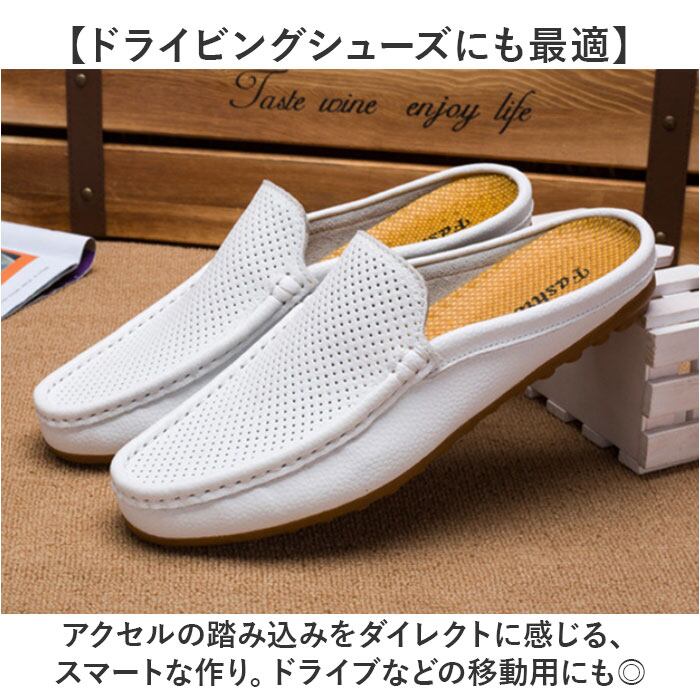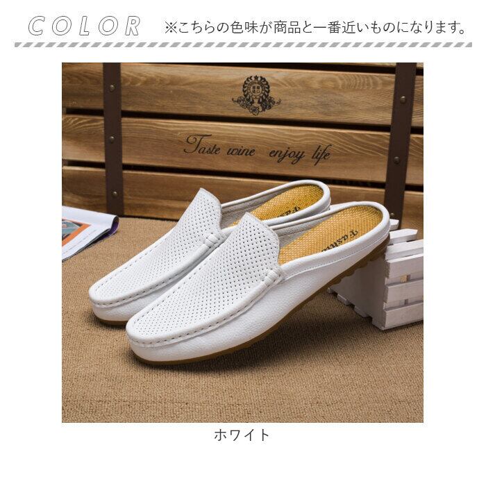 ・レザー生地のキレイめデザインなのに、実はかかとなしタイプ。気軽にサッと履けるのがGOOD。