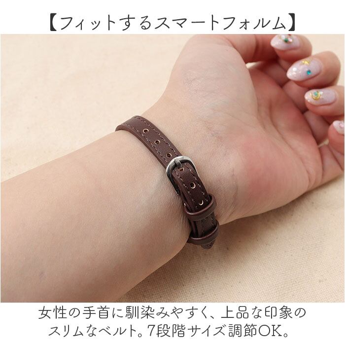 ・女性の手首に馴染みやすく、上品な印象のスリムなベルト。7段階サイズ調節OK。