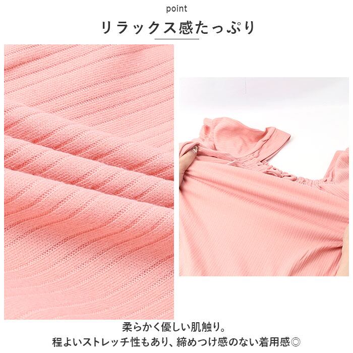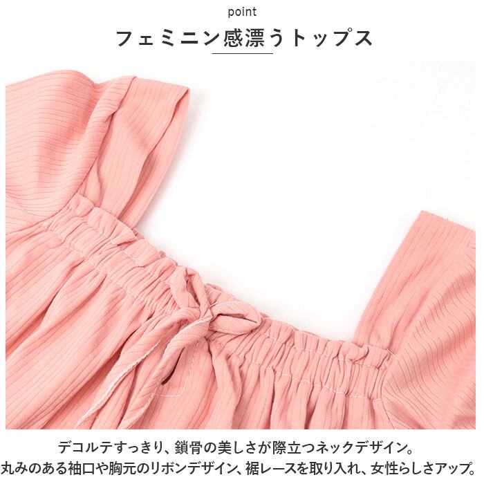 ・デコルテすっきり、鎖骨の美しさが際立つネックデザイン。丸みのある袖口や胸元のリボンデザイン、裾レースを取り入れ、女性らしさアップ。