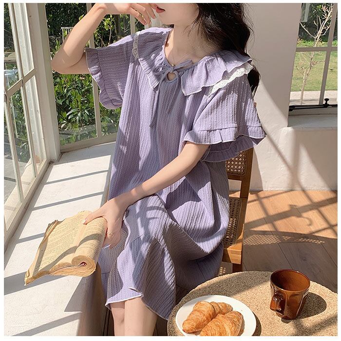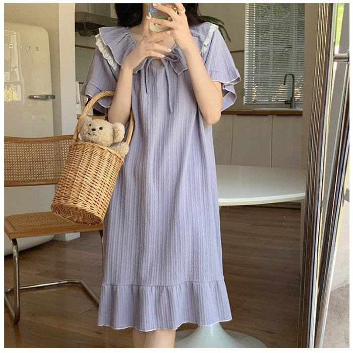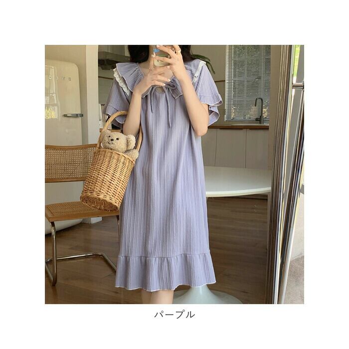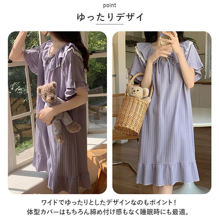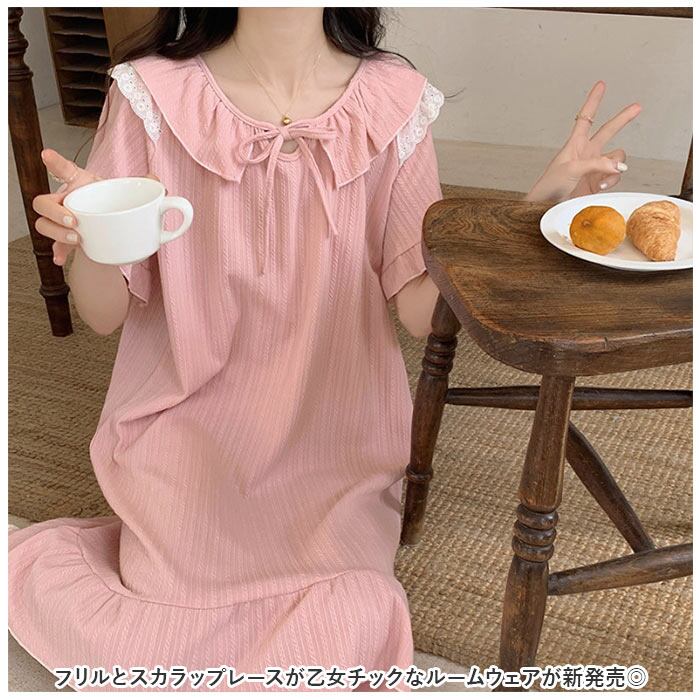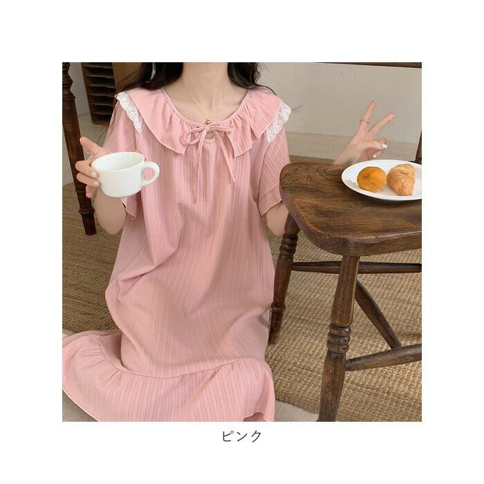 ルームウェア レディース 夏 通販 ネグリジェ 寝間着 パジャマ ナイトドレス 半袖 ロング ロング丈 ゆったり 体型カバー リボン レース 薄い カジュアル かわいい おしゃれ