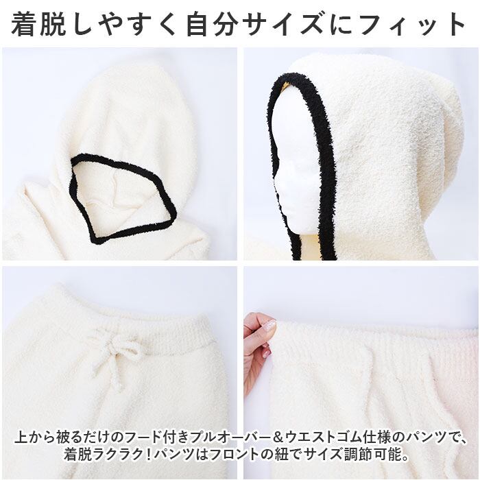 ・上から被るだけのフード付きプルオーバー&ウエストゴム仕様のパンツで、着脱ラクラク!パンツはフロントの紐でサイズ調節可能。