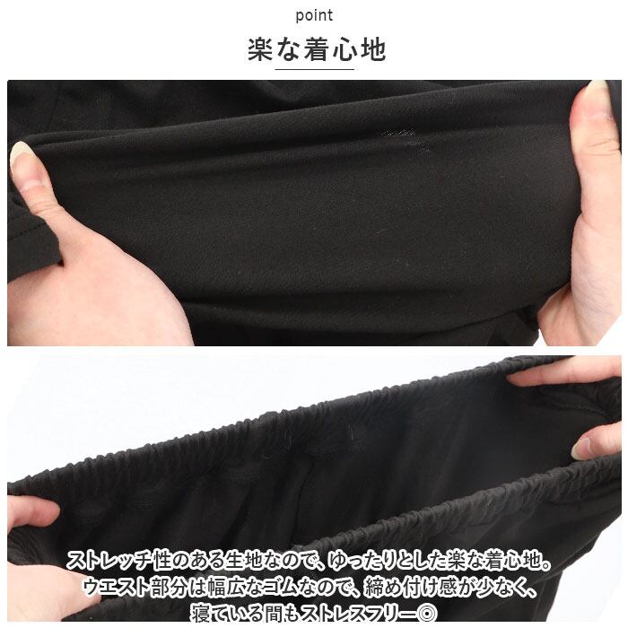 ・ストレッチ性のある生地なので、ゆったりとした楽な着心地。ウエスト部分は幅広なゴムなので、締め付け感が少なく、寝ている間もストレスフリー◎