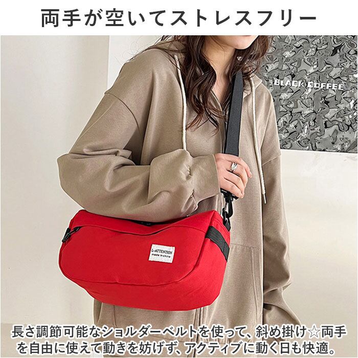 ・長さ調節可能なショルダーベルトを使って、斜め掛け☆両手を自由に使えて動きを妨げず、アクティブに動く日も快適。