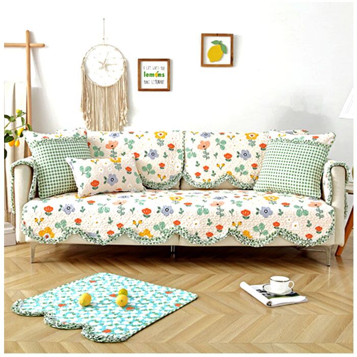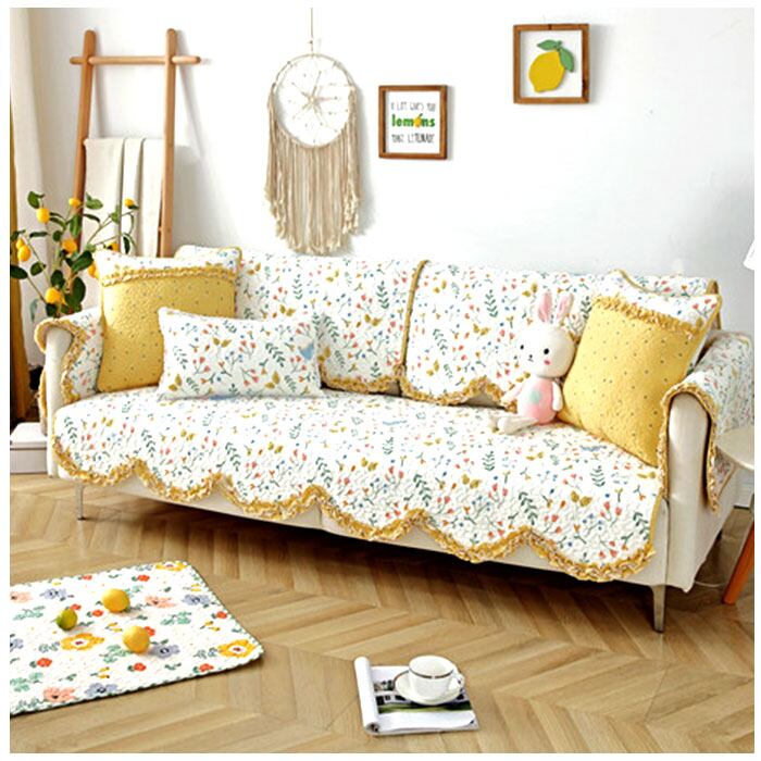 ・手描き風デザインとサイドのレースがお部屋をほっこりやさしい雰囲気に。サッとソファーに掛けるだけでインテリアのイメチェンが完了!