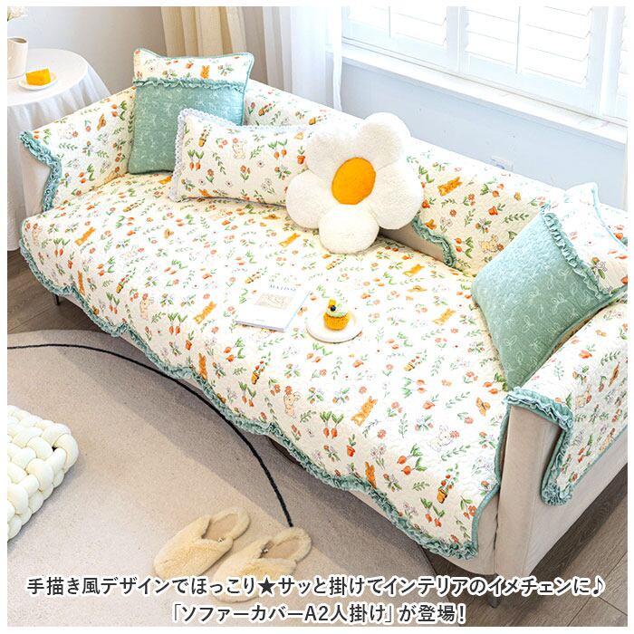 ・手描き風デザインでほっこり★サッと掛けてインテリアのイメチェンに♪「ソファーカバーA2人掛け」が登場!
