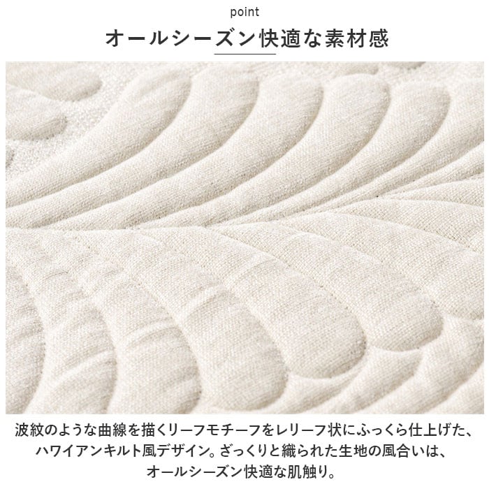 ・波紋のような曲線を描くリーフモチーフをレリーフ状にふっくら仕上げた、ハワイアンキルト風デザイン。ざっくりと織られた生地の風合いは、オールシーズン快適な肌触り。