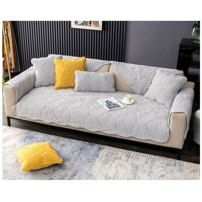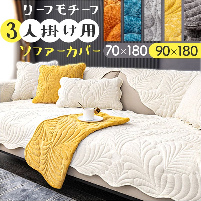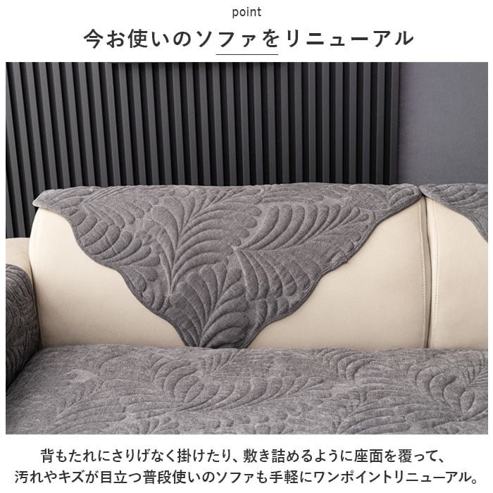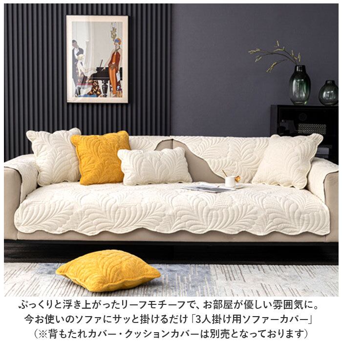 ・ぷっくりと浮き上がったリーフモチーフで、お部屋が優しい雰囲気に。今お使いのソファにサッと掛けるだけ「3人掛け用ソファーカバー」