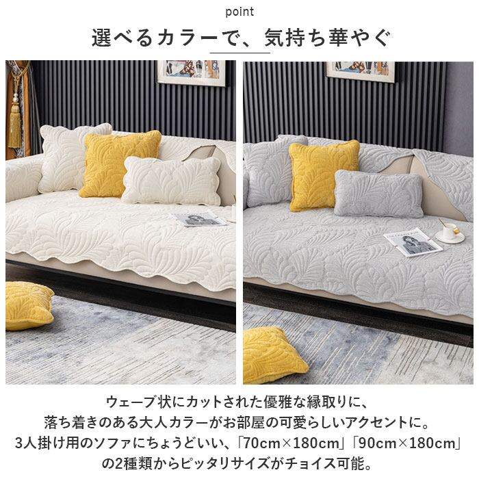 ・ウェーブ状にカットされた優雅な縁取りに、落ち着きのある大人カラーがお部屋の可愛らしいアクセントに。3人掛け用のソファにちょうどいい、「70cm×180cm」「90cm×180cm」の2種類からピッタリサイズがチョイス可能。