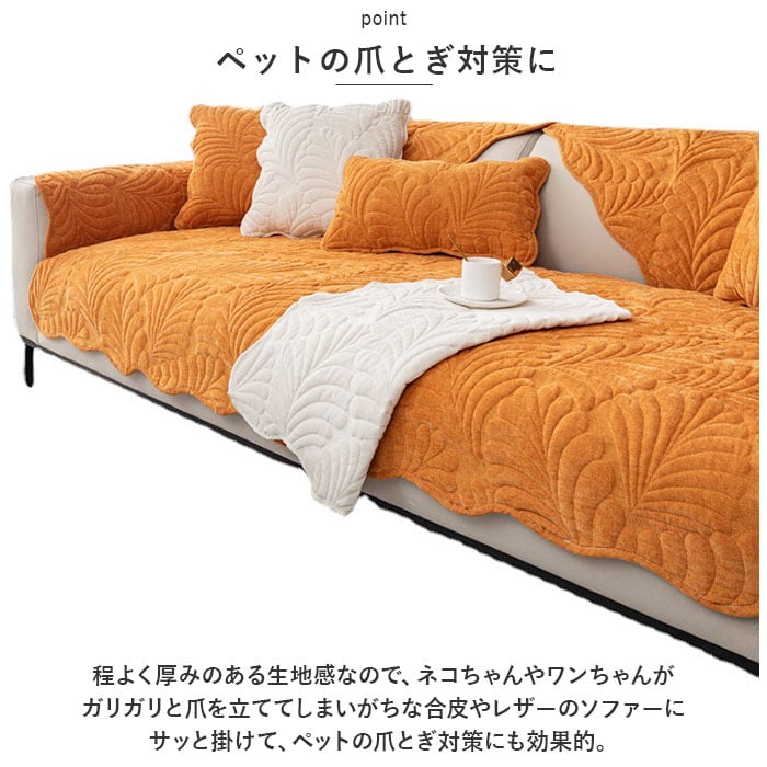 ・程よく厚みのある生地感なので、ネコちゃんやワンちゃんがガリガリと爪を立ててしまいがちな合皮やレザーのソファーにサッと掛けて、ペットの爪とぎ対策にも効果的。