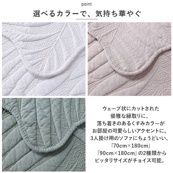 ・ウェーブ状にカットされた優雅な縁取りに、落ち着きのあるくすみカラーがお部屋の可愛らしいアクセントに。3人掛け用のソファにちょうどいい、「70cm×180cm」「90cm×180cm」の2種類からピッタリサイズがチョイス可能。