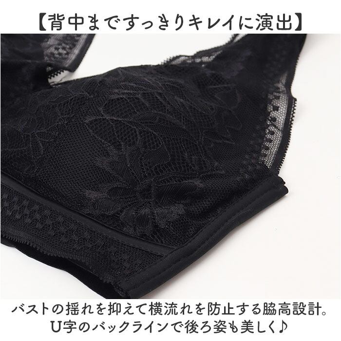 ・バストの揺れを抑えて横流れを防止する脇高設計。U字のバックラインで後ろ姿も美しく♪