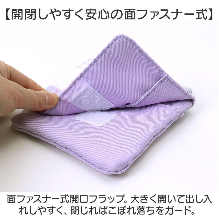 ・面ファスナー式開口フラップ。大きく開いて出し入れしやすく、閉じればこぼれ落ちをガード。