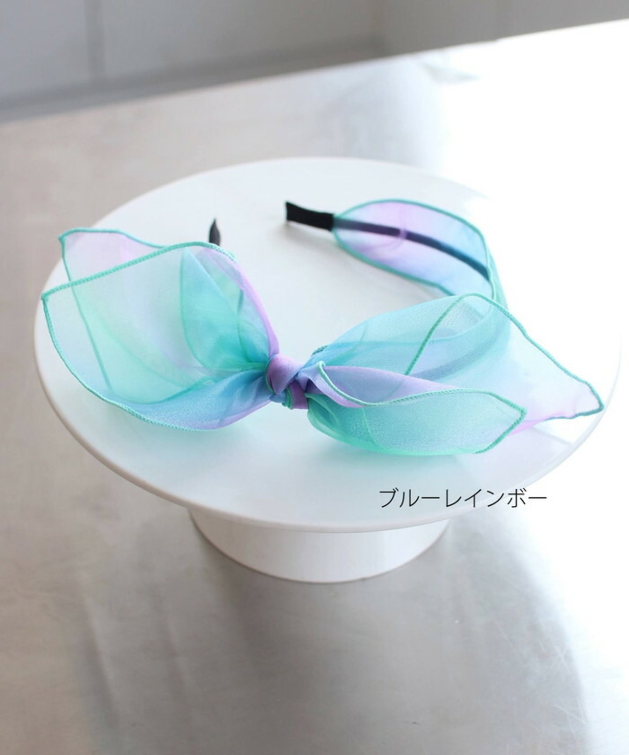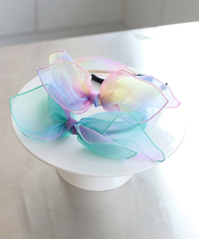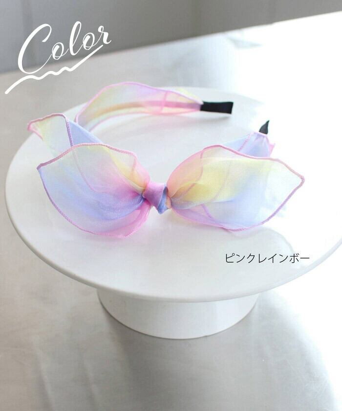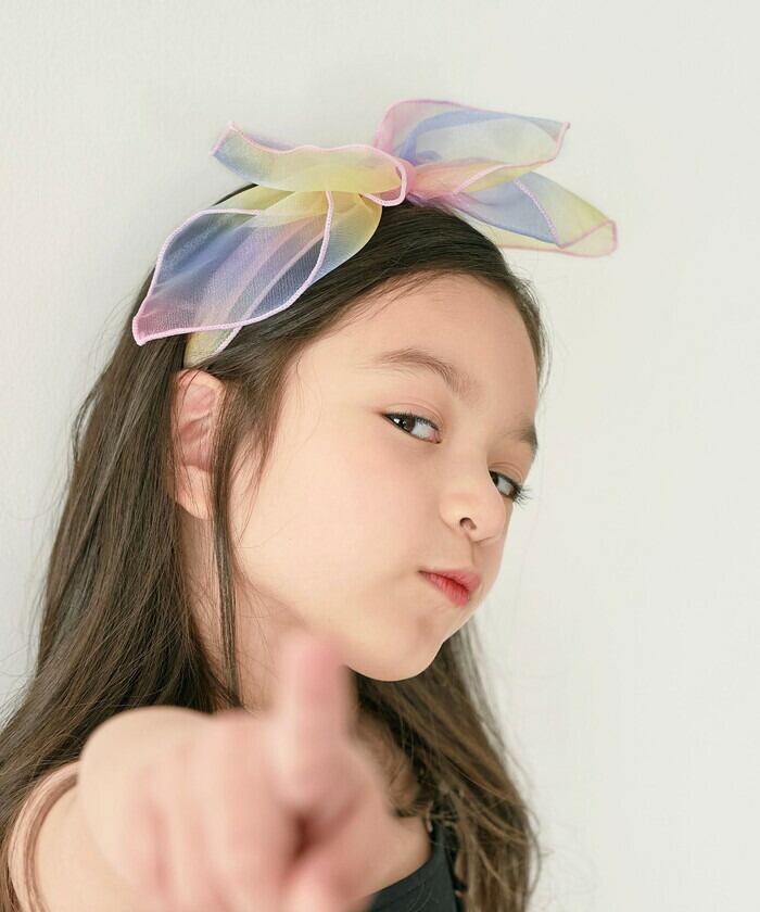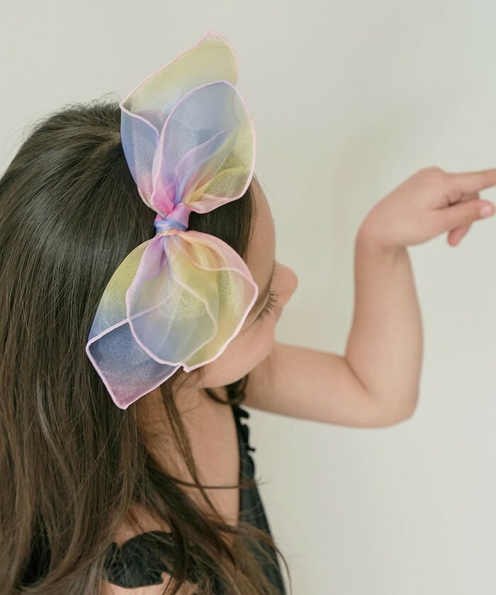 ・シアーレインボーカラーが夏コーデにアクセントとになる子供服Roraスエレインボーリボンカチューシャです。