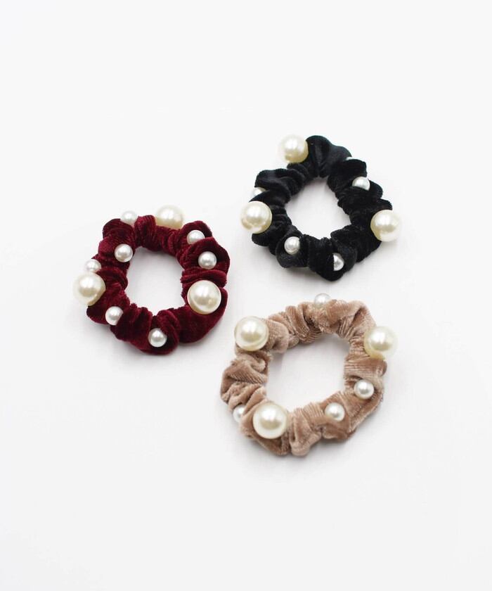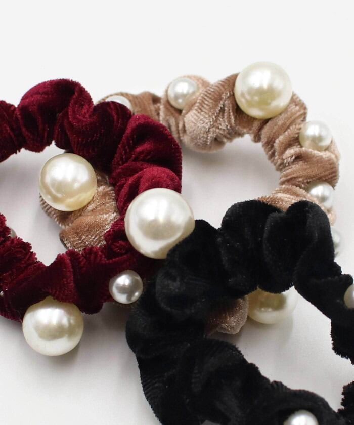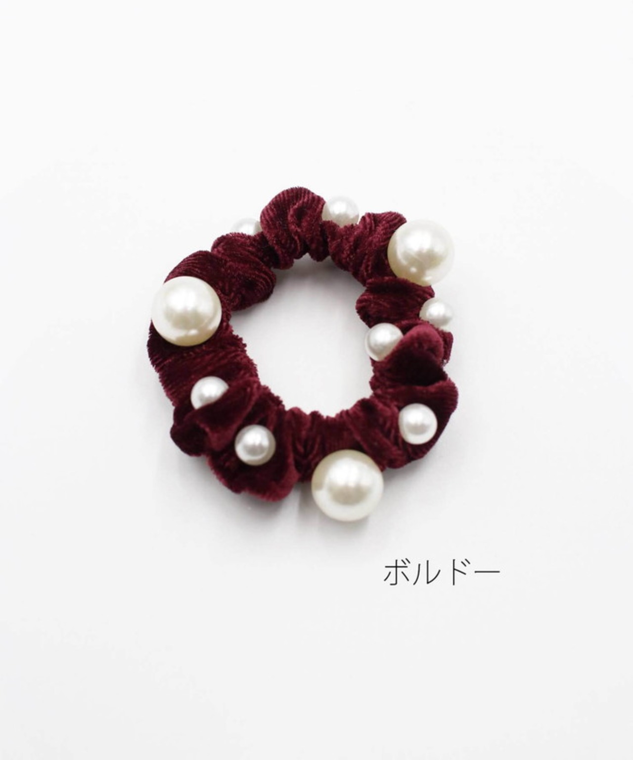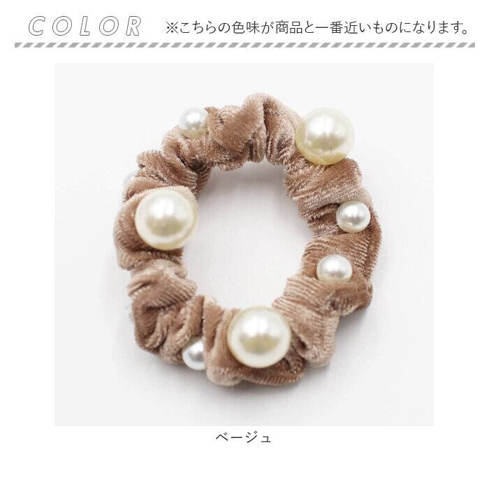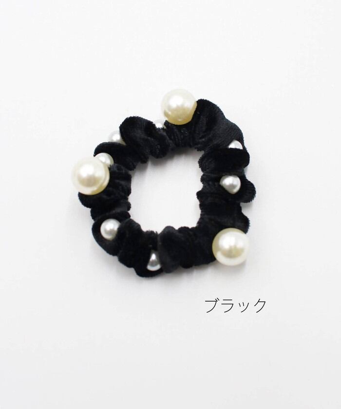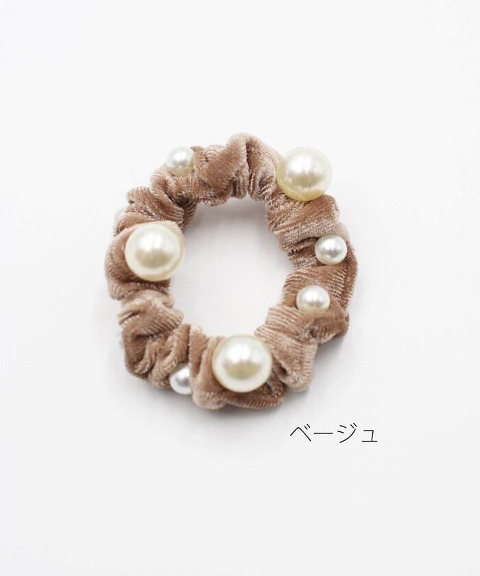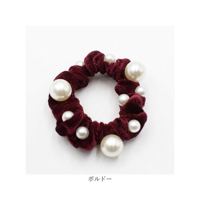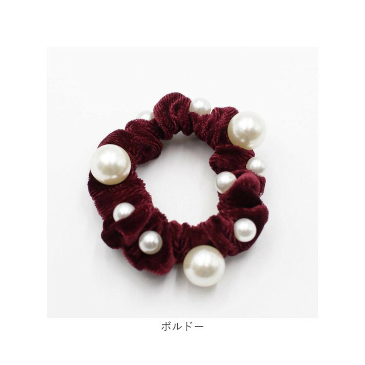 ・小さめのベルベットシュシュに様々な大きさのパールをランダムで散らかした、そのランダム性がお洒落なシュシュです。