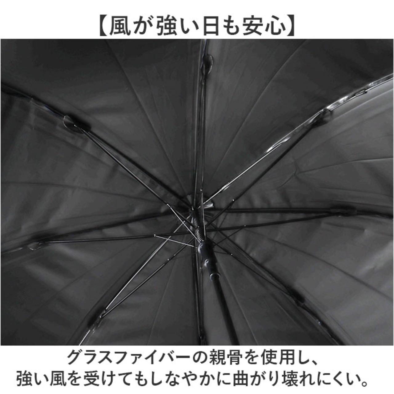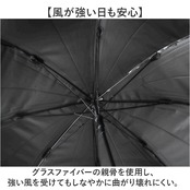 ・グラスファイバーの親骨を使用し、強い風を受けてもしなやかに曲がり壊れにくい。