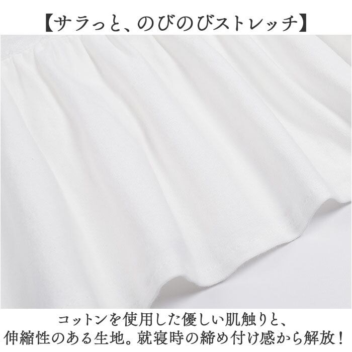 ・コットンを使用した優しい肌触りと、伸縮性のある生地。就寝時の締め付け感から解放!