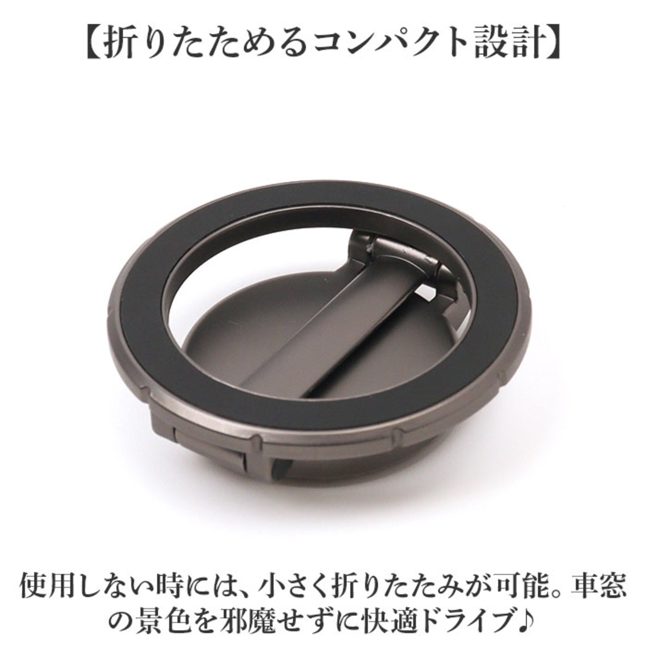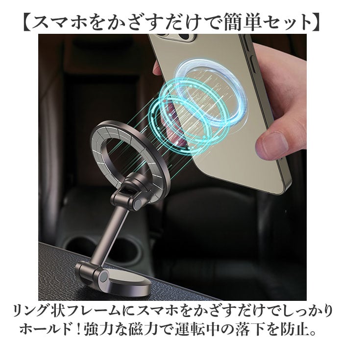 ・リング状フレームにスマホをかざすだけでしっかりホールド!強力な磁力で運転中の落下を防止。