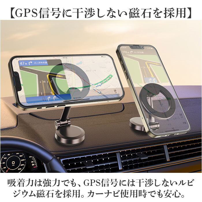 ・吸着力は強力でも、GPS信号には干渉しないルビジウム磁石を採用。カーナビ使用時でも安心。