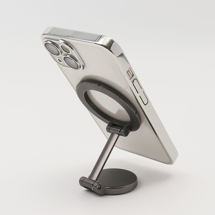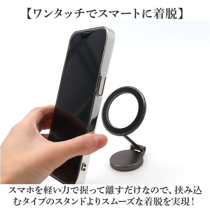 ・スマホを軽い力で握って離すだけなので、挟み込むタイプのスタンドよりスムーズな着脱を実現!