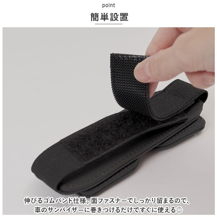 ・伸びるゴムバンド仕様。面ファスナーでしっかり留まるので、車のサンバイザーに巻きつけるだけですぐに使える◎