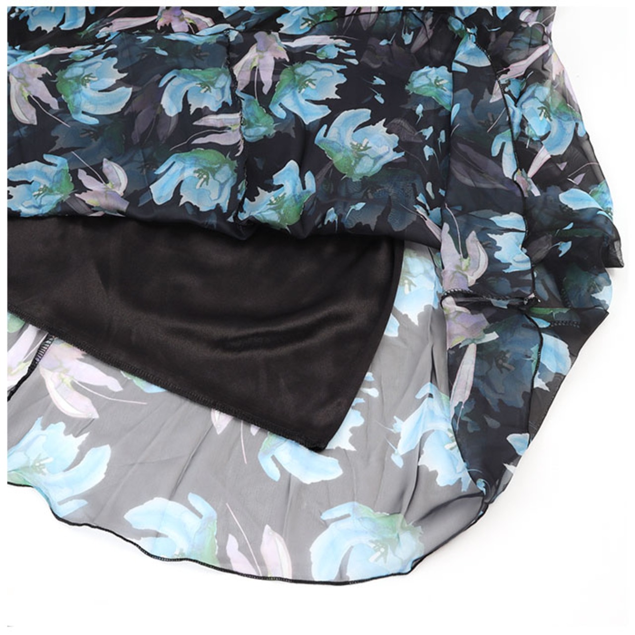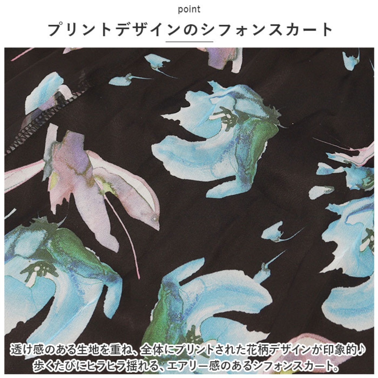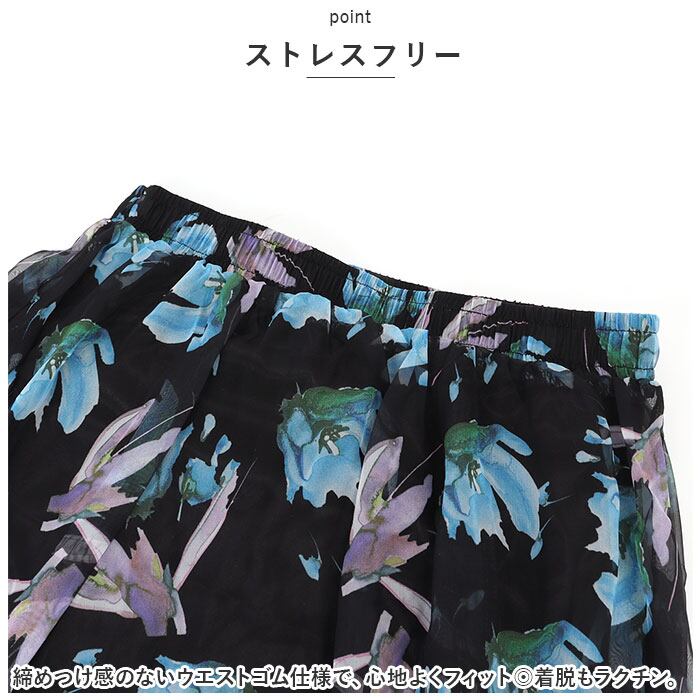 ・透け感のある生地を重ね、全体にプリントされた花柄デザインが印象的♪歩くたびにヒラヒラ揺れる、エアリー感のあるシフォンスカート。