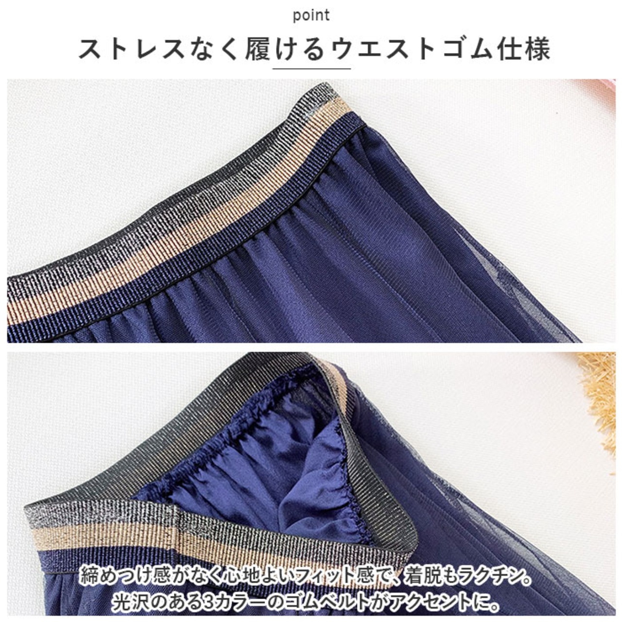 ・チュールの下(裏地)は滑らかな素材。すとんと落ちてめくれ上がることなく、快適な着用感!